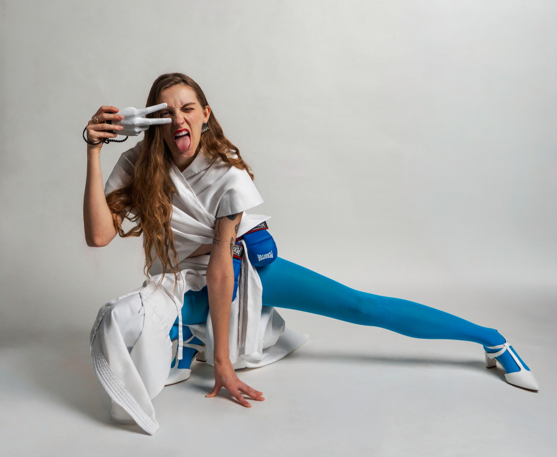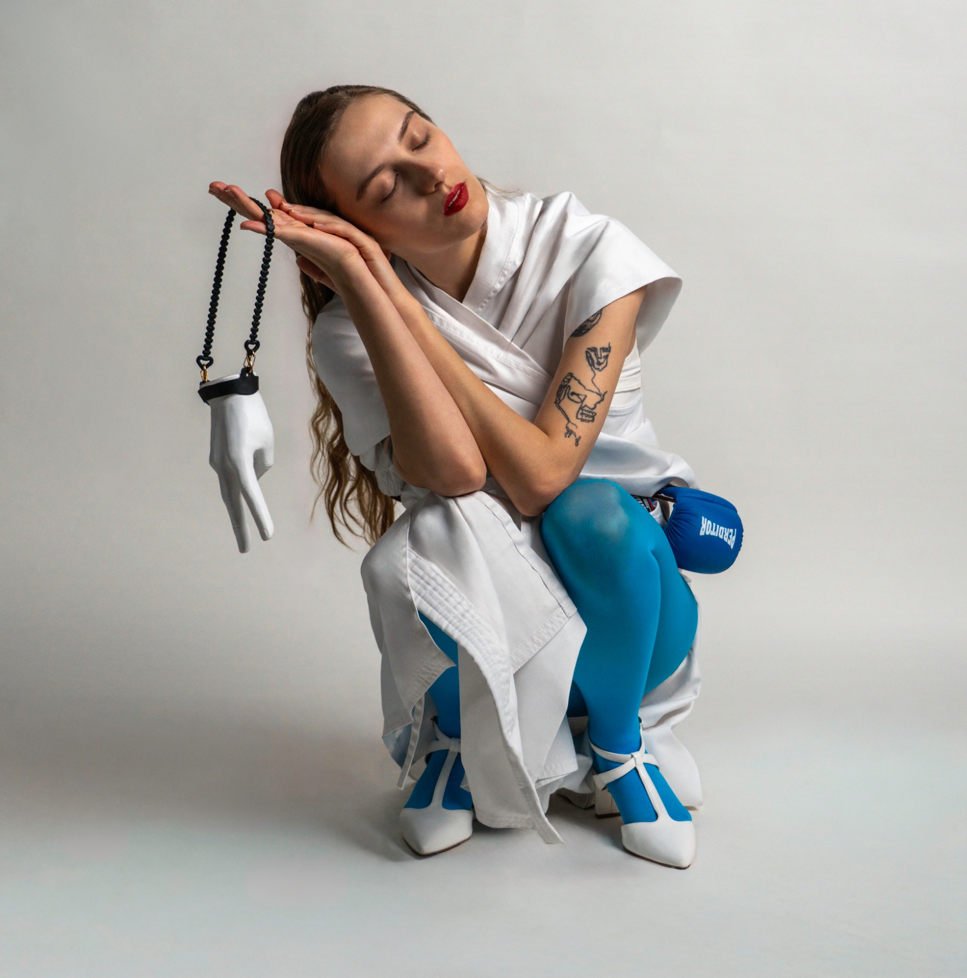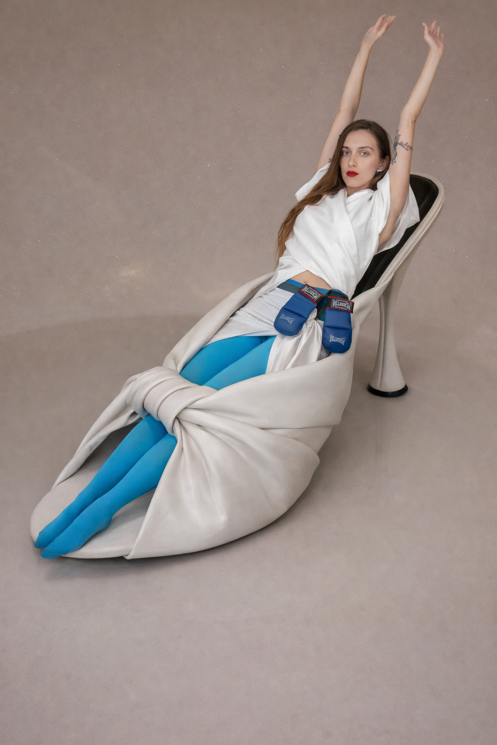 A TRADITIONALLY MASCULINE GARMENT IS RESHAPED INTO A FEMININE SILHOUETTE, BALANCING SOFTNESS AND DISCIPLINE. THE PEACE SIGN, PAIRED WITH A PLASTIC RAINCOAT, QUESTIONS WHETHER PEACE IS PROTECTION OR JUST ANOTHER FRAGILE LAYER.
