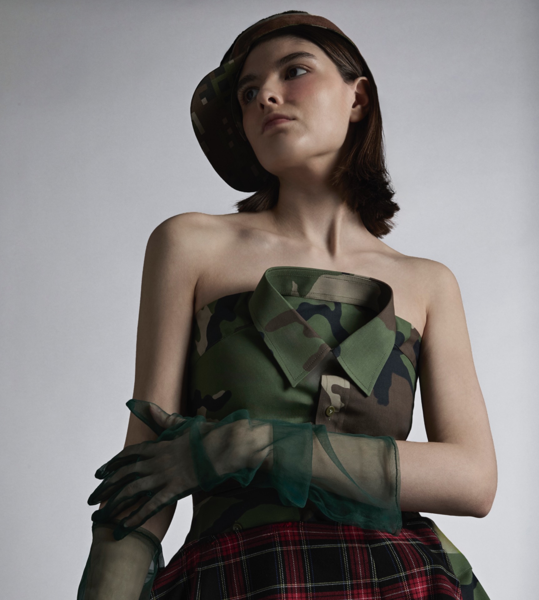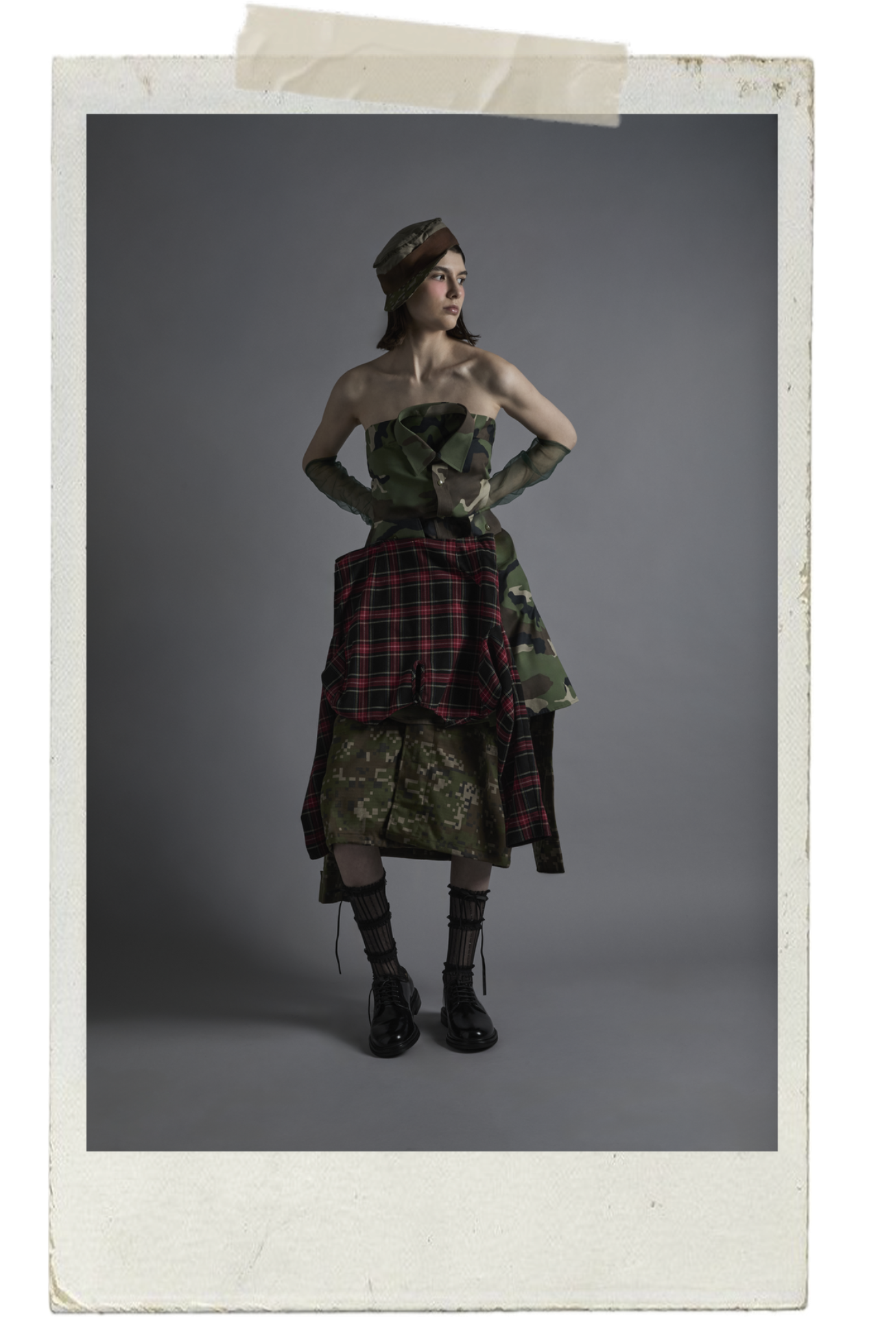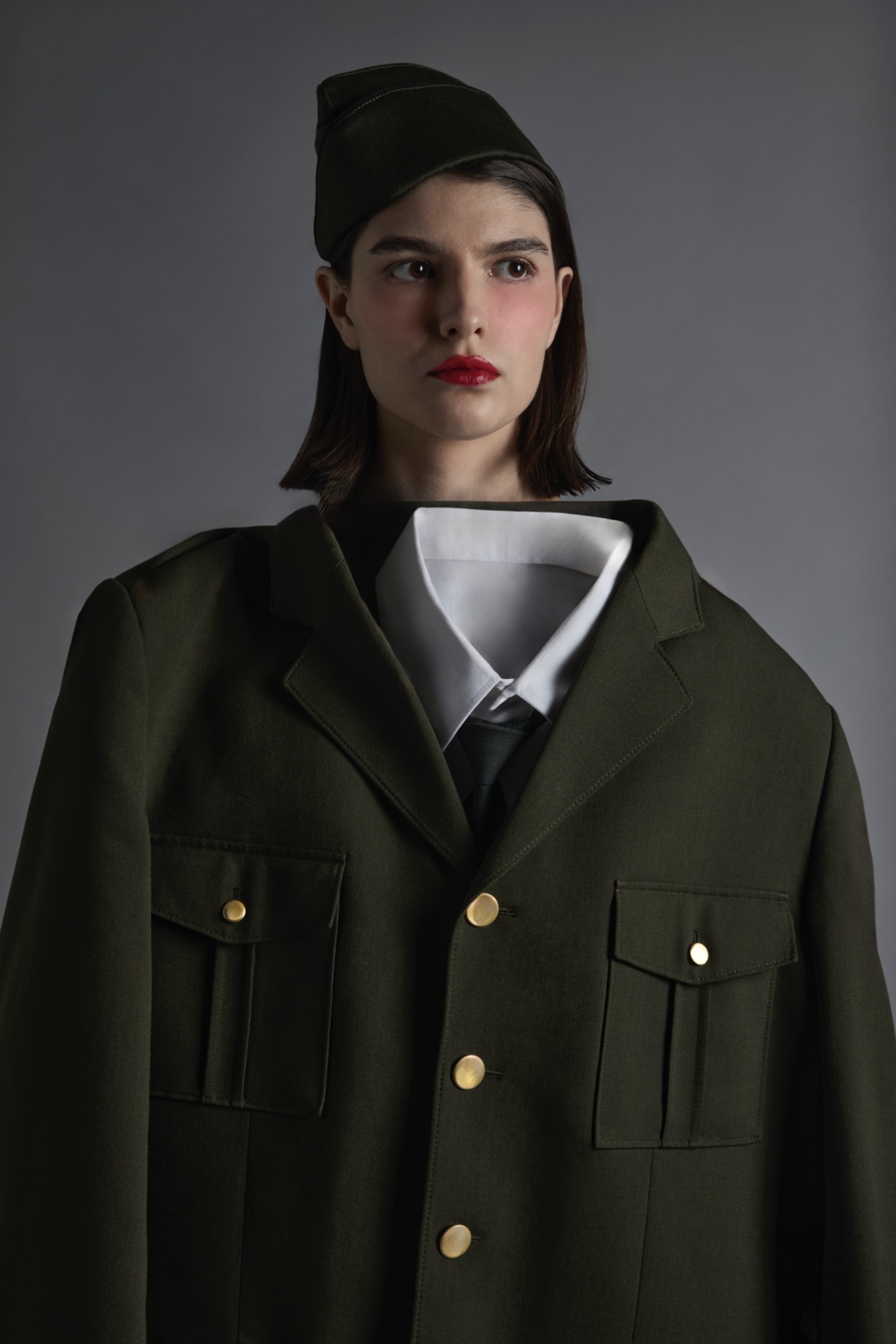 THE EDITORIAL COMBINES MILITARY AESTHETICS WITH GENDER-FLUID FASHION, QUESTIONING STRUCTURE, DISCIPLINE, AND FIXED IDENTITY. GARMENTS ARE NOT PROPERLY WORN BUT SUSPENDED ON THE BODY, CREATING A VISUAL DISCONNECTION BETWEEN CLOTHING AND FORM.