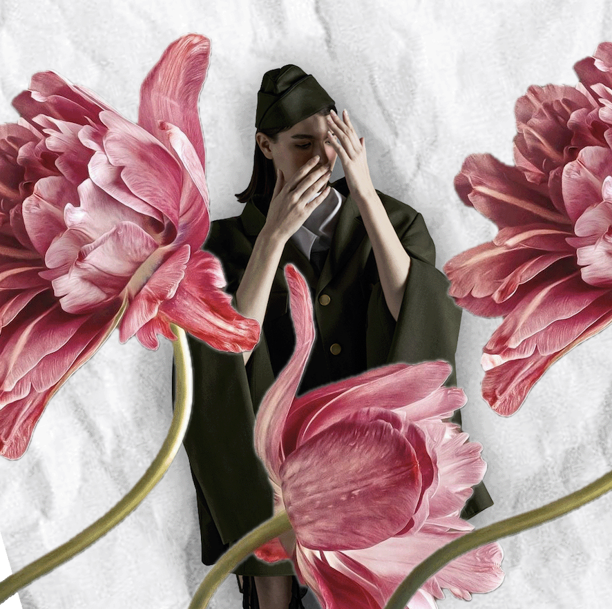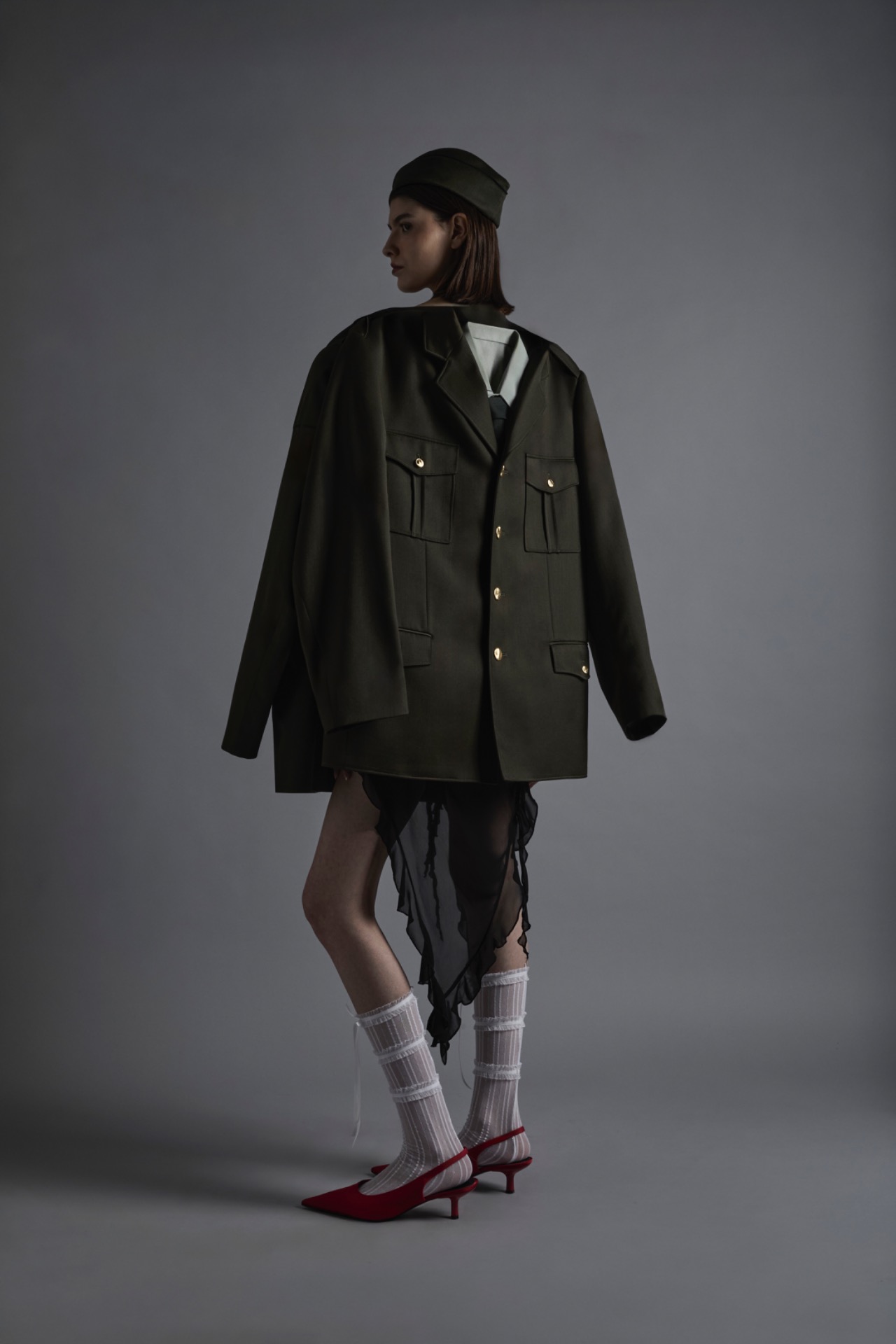 A TRADITIONALLY MASCULINE GARMENT IS RESHAPED INTO A FEMININE SILHOUETTE, BALANCING SOFTNESS AND DISCIPLINE. THE PEACE SIGN QUESTIONS WHETHER PEACE IS PROTECTION OR JUST ANOTHER FRAGILE LAYER.